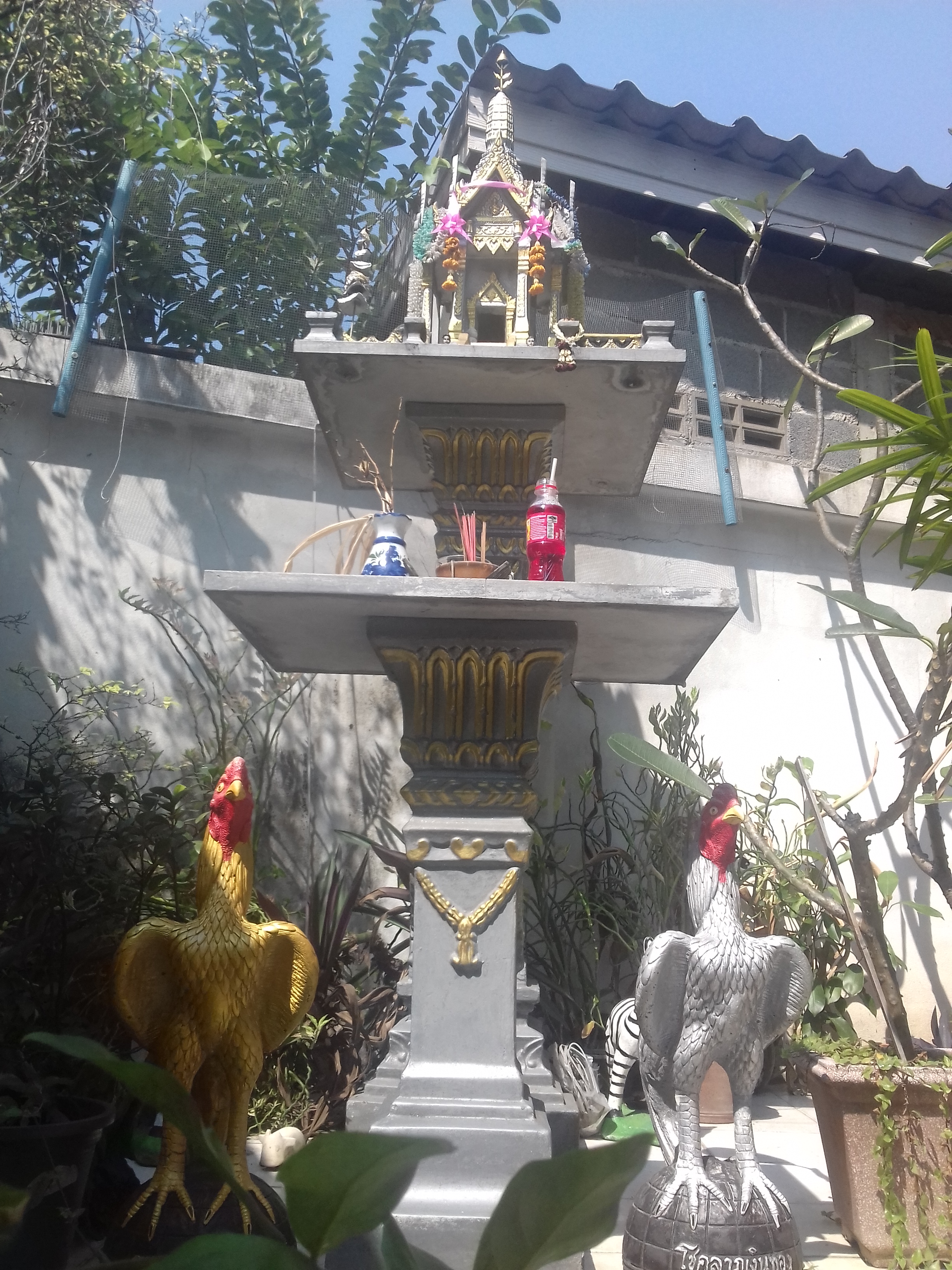 Nous apprenons que chaque maison ou magasin installe un petit temple dédié à ses morts. Les Thaïlandais leur offrent des fleurs mais aussi des boissons avec paille, ce qui me fait penser qu’il n’y a plus de frontières entre le monde des morts et des vivants.