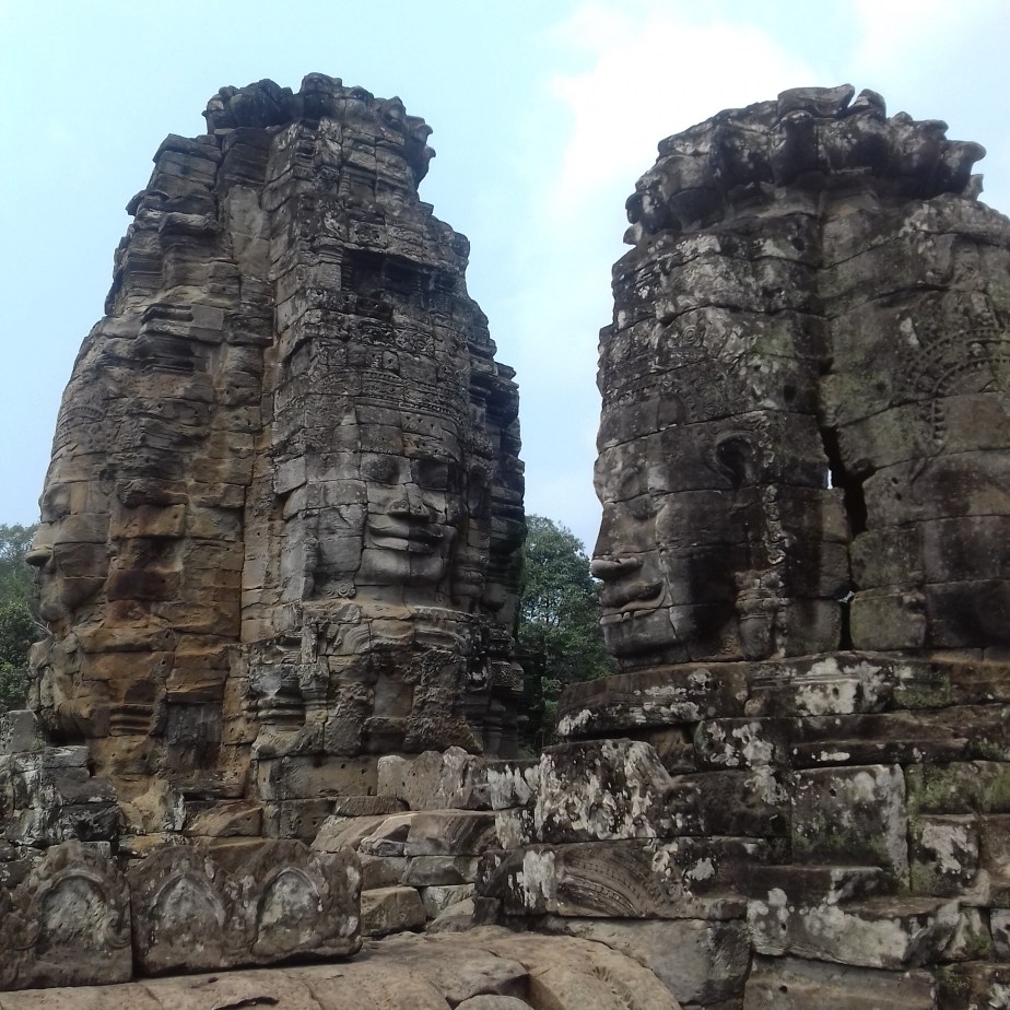Les visages sculptés du temple Bayon, d’influence bouddhiste, sont une énigme. Il s’agit de tours à 4 visages, orientés vers les 4 points cardinaux. Ces visages pourraient représenter Lokeshvara, un Bodhisattna vénéré sous le règne du roi Jayavarma VII. D’autres pensent que ces visages sont ceux du roi. Nous les trouvons magnifiques, paisibles et joyeux, nous contemplant du haut de leur éternité.