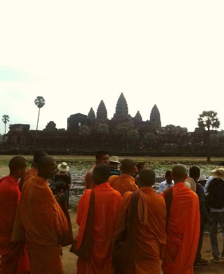 La chaleur est écrasante. Nous avançons entre les moines bouddhistes et les Chinois insupportables. La forme pyramidale d’Angkor Vat mais aussi de la plupart des temples est liée à l’hindouisme, religion qui domina Angkor pendant plusieurs siècles. Ces formes montagneuses des temples représentent le mont Meru, la demeure des dieux hindous. Les cinq sanctuaires d’Angkot Wat symbolisaient ainsi les cinq pics du mont Meru tandis que les douves disposées autour représentaient l’océan cosmique séparant le monde des Hommes de l’univers des dieux.