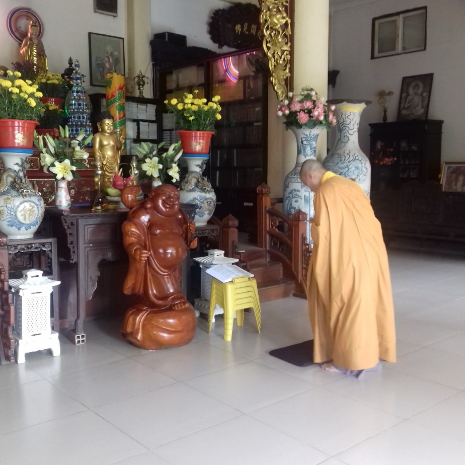 Arrivés à Rach Gia, on se retrouve loin du centre et seules deux moto-taxis patientent à la gare routière. Complètement décomplexé, l’un d’eux se met à tâter les couilles de Merlin en riant. Il se fait pas mal pinçouiller et triturer depuis la Thaïlande mais jusqu’à présent il s’agissait de petites marques d’affection pas du tout gênantes sur le bras ou la joue. Ici, on atteint un degré de proximité…surprenant. Heureusement que Merlin n’est pas pudique, lui ça le fait rire. Moi je trouve ça obscène et je suis prête à rembarrer le gars s’il recommence. On se met d’accord sur un prix et nous revoilà avec le sac à l’avant, le driver, moi en sandwich et Merlin derrière. Chacun avec en plus un sac à dos…Je supplie ma bonne étoile de nous protéger. Il y a encore plus de deux roues que dans les pays précédents. On glisse dans une horde de scooters et de motos qui obéissent à des codes indéchiffrables. Le chauffeur ne trouve pas notre hôtel. Il s’arrête demander la route régulièrement. Enfin il nous dépose et…me demande le double du prix fixé au départ. Je déteste la fourberie et lui donne ce qui était prévu en faisant comme si je n’avais rien compris. Il n’insiste pas. On dépose nos sacs, on se lave puis on ressort pour dîner mais ô miracle la divine pluie nous surprend. Cela fait deux mois, oui deux mois, et pour des bretons c’est énorme, que nous n’avons pas senti la pluie sur nos têtes. Un orage puissant gronde en même temps. Après la chaleur de Kep, je remercie le ciel de déverser cette eau fraîche sur nous. Cependant, elle est terriblement puissante cette pluie et un homme nous propose de rentrer nous abriter chez lui. Nous nous retrouvons pour la première fois dans une maison vietnamienne, ouverte sur la rue. Au centre, se trouve un autel avec des portraits de gens morts, enfin cela me semble évident qu’ils sont morts car il y a des offrandes de fruits autour et des encens ainsi qu’une statuette de Bouddha. La télévision est allumée mais on regarde la rue, les sacs que les gens se sont enfilés pour se protéger, le ballet de scoots pétaradants sous le déluge. Soudain, c’est l’accalmie, on remercie avec le seul mot que l’on ait appris pour le moment : « Cam On », merci. On ne cherche pas longtemps un endroit pour dîner : une gargote fumante semble nous attendre sur le trottoir. La femme prépare une soupe de riz avec des légumes. Ça ira très bien !