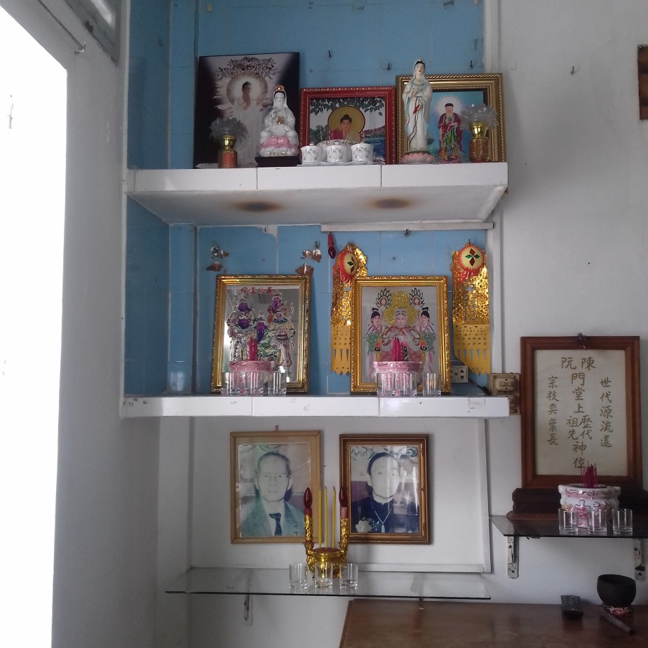Nous la suivons dans la ruelle la plus étroite du monde. Là où un Amerloc obèse ne passerait jamais. Sa chambre est belle, au dernier étage, avec l’autel des morts mais cela ne nous effraye pas. Nous voyons la ville et la nuit, quand on allume l’interrupteur, de petites lampes rouges clignotent autour des portraits des morts, des figures bouddhiques et…la Vierge Marie.