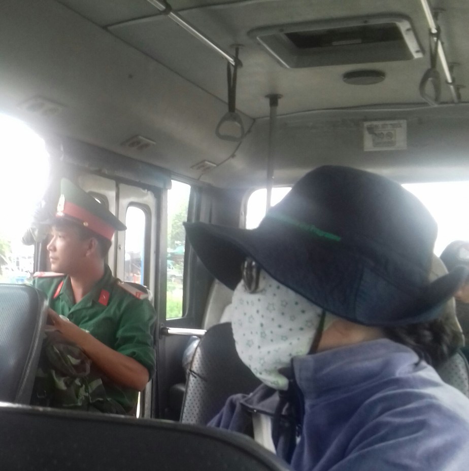 Nous quittons l’étroite ruelle pour la ville de Vinh Long, en bus local, rempli de marchandises et de gens au visage caché.