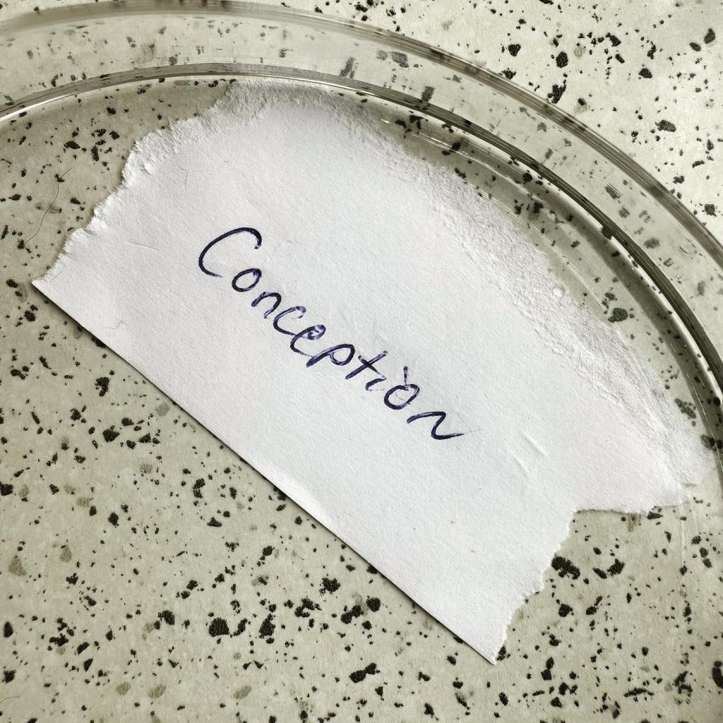J’ai écrit le mot « conception » en pensant à la conception d’un bébé. L’eau a créé une image intrigante, qui ressemble à un spermatozoïde dans un ovule, ou peut-être à un ovule dans un sac amniotique. Veda Austin