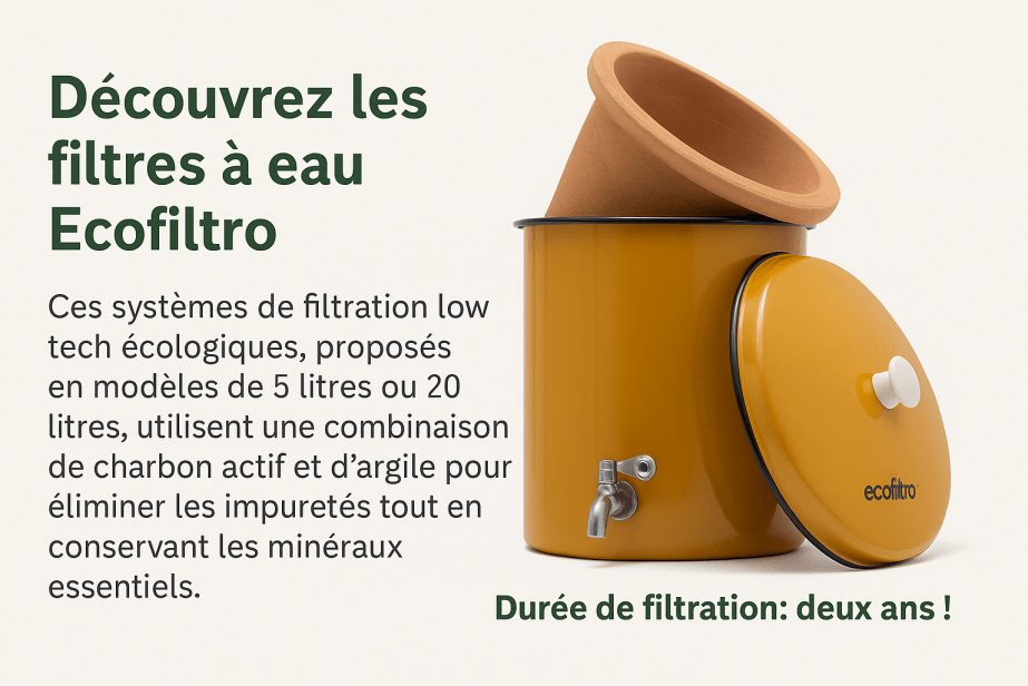 💧 Ecofiltro 5L ou 20L Un filtre à eau en argile, charbon actif et argent colloïdal. Sans électricité, esthétique, durable, il élimine chlore, métaux lourds, pesticides, microplastiques… tout en conservant les bons minéraux.