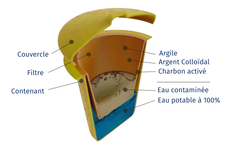 Argile : elle crée des passages microscopiques qui laissent passer les molécules d’eau mais pas les principaux contaminants, les bactéries ni les parasites. Les pores ont une taille maximale de 0,8 micromètre. Et bien sûr, elle ne laisse pas passer les particules solides.