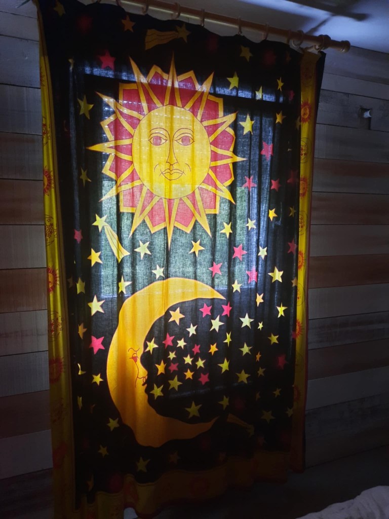 - Le violet, symbole de transcendance, de mutation spirituelle, et de fusion entre le sang (rouge) et l’esprit (bleu) avec ma grande tenture postée à l’entée/sortie de la maison !