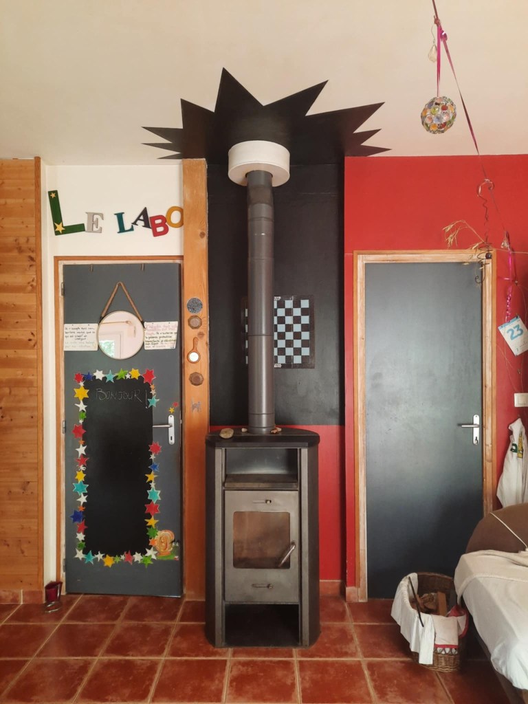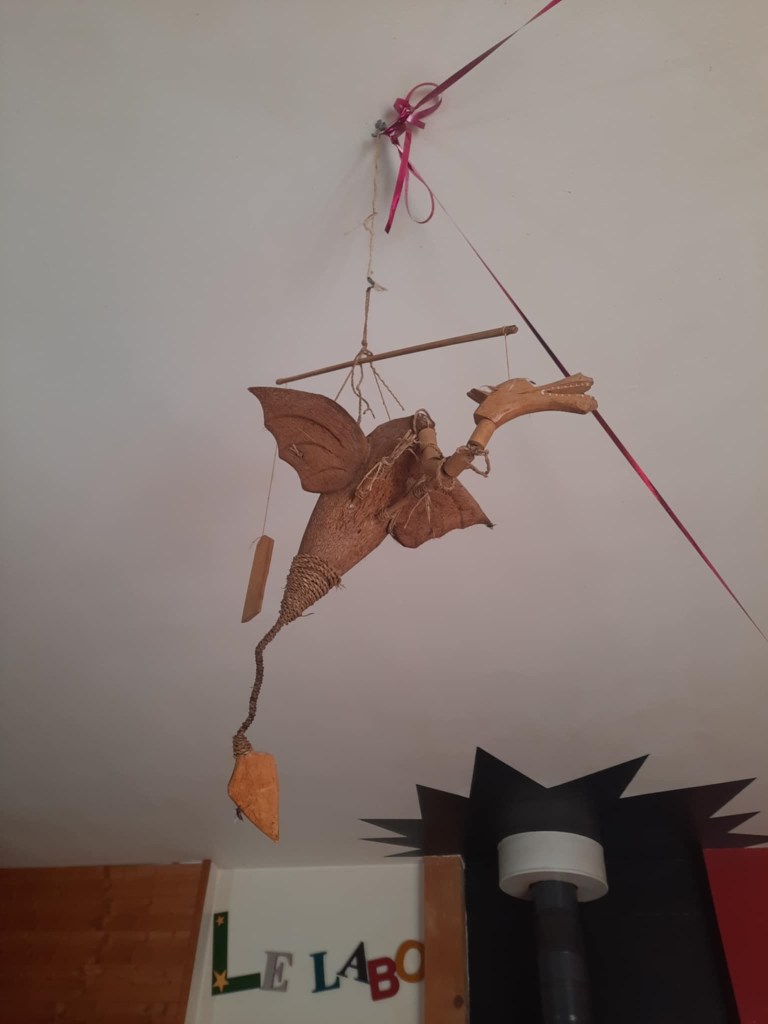 Un dragon indonésien, creusé dans une noix de coco, veille au plafond. Là encore, je ne savais pas qu’il symbolise la force transformatrice de l’alchimiste, mais il m’appelait. Et le poêle à bois, au centre de la maison, me semblait évident, mais c’est maintenant que je réalise qu’il incarne le feu de la transmutation, le feu central de l’Œuvre et que j’ai carrément peint une explosion dimensionnelle au plafond il y a 3 ans !