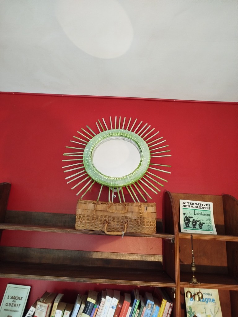 Attendez, ce n’est pas fini ! Sur ma bibliothèque presque vide, épurée à force de trier le bon grain de l’ivraie, j’ai placé récemment un miroir que ma mère m’avait donné.