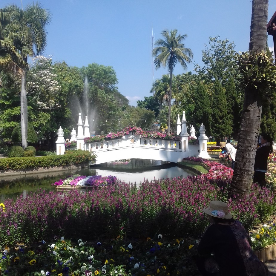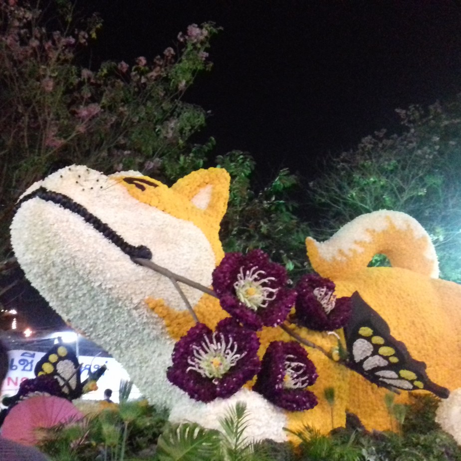 C’est surtout au parc public « Buak Had », au sud-est de la vieille ville de Chiang Mai que se trouvent la plupart des arrangements floraux. On se croyait au jardin d’Eden tellement c’est beau. Partout des entrelacs de couleurs et d’odeurs, sous un soleil généreux mais jamais insupportable. Ici et là des libellules, des papillons, de tous petits enfants qui s’entraînent à leur spectacle de chants du week-end, des maîtresses qui semblent douces avec eux, des policiers sur leurs smartphones…Des hamacs fleuris, des carrés de fleurs flottantes, des tapis de cosmos roses, des hortensias, et au loin les cocotiers et les bananiers…Tout est soigneusement mis en scène dans ce parc somptueux pendant les quelques jours qui précèdent l’évènement.