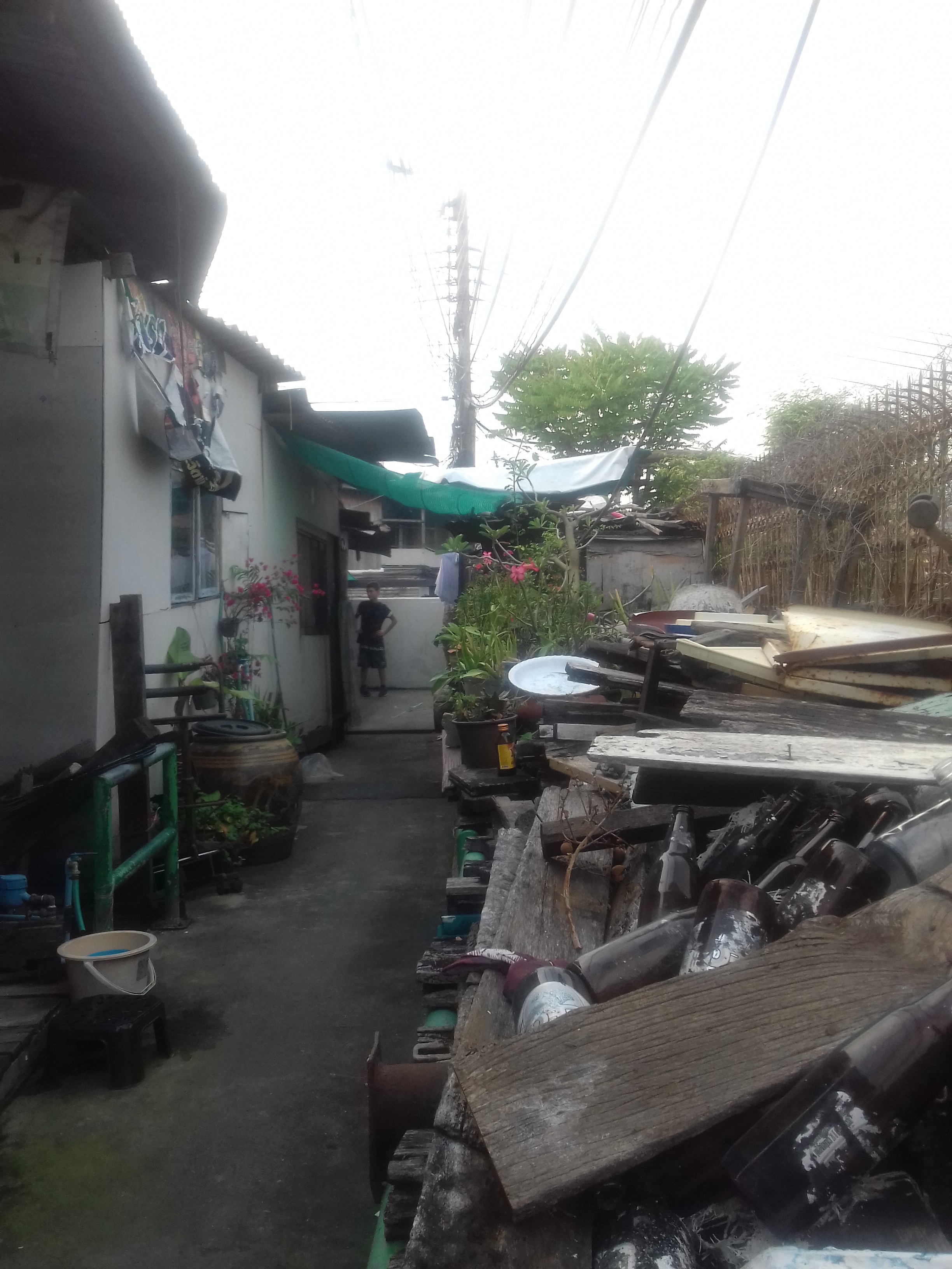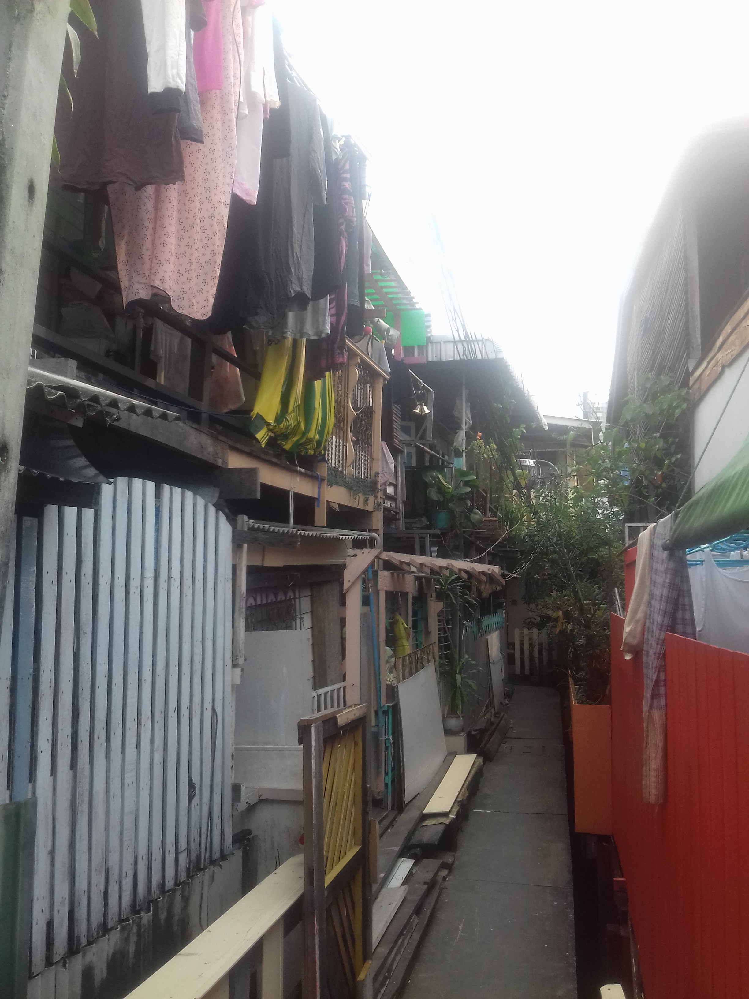 On ne voyait pas du tout comment sortir et soudain, comme par miracle, une très jolie jeune fille est apparue et nous a dit tout bas : « Follow me, follow me », avec un grand sourire. Elle portait la tenue des collégiennes et écoutait de la musique avec son téléphone. Je lui ai demandé d’écouter, c’était les « Black eyed peas » qu’on écoutait à fond la caisse avec Merlin à un moment quand il était tout petit. Elle m’a expliqué qu’elle allait à l’école le lendemain mais qu’elle quittait le klong le soir pour dormir près de son école chez une tante ou une amie je n’ai pas compris. Une fois sortis du dédale fascinant, elle a hélé un taxi et lui a demandé d’aller à notre hôtel. Adorable petite chérie, nous l’avons remerciée chaleureusement.