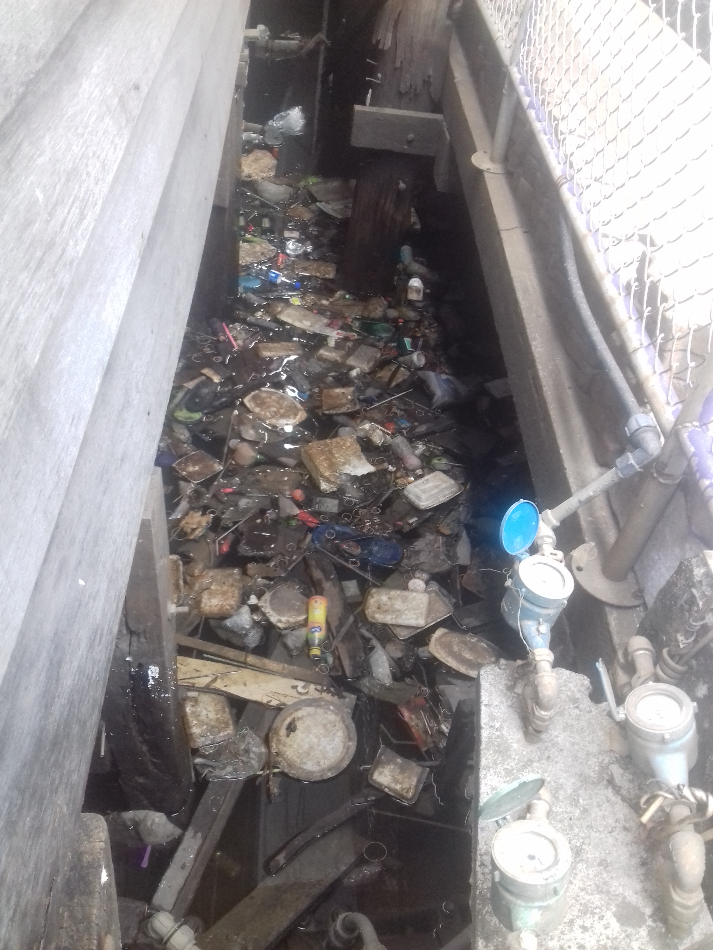 L’eau de la rivière se trouve sous cette couche de déchets.